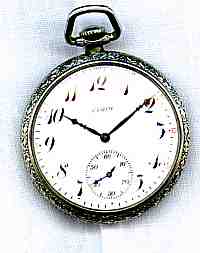 Elgin. PW/PS- 7 Jewel Nickel Movement. Serial #2656xxxx places production approximately 1923. Dial is a Very nice enamel with Fancy arabic numerals and red outside 5 min. markers. Watch is cased in a wadsworth White rolled plate. This would make an excellent carry watch.See Photo Here.