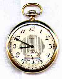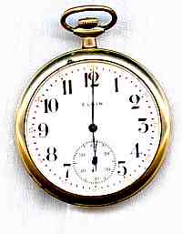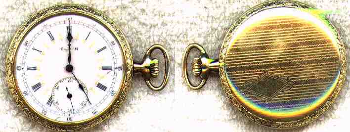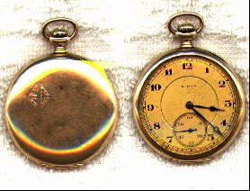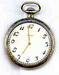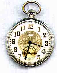Elgin. PW/PS- 17 Jewel Nickel movement. Serial # 2612xxxx places producion approximately 1923. Dial is a fancy 2 tone silver with fancy arabic numerals. Watch is nice yellow gold filled case with no brass showing.See Photo Here.