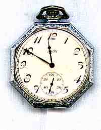 Elgin. PW/PS- 7 Jewel Nickel movement. Sereial #1404xxxx places production approximately 1909. Painted dial with fancy arabic numerals in in good condition. Watch is cased in a nice Octogonal shaped base metal case .See Photo Here.