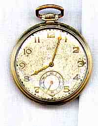 Elgin. PW/PS- 15 Jewel Nickel movement. Serial # 3549xxxx places producion approximately 1934. This is a strange dial, it is painted with gold applied arabic numerals. The dial also has some sort of texturing.. The scanner doesn't show this in the manner in which it really appears. Watch has gold hands. Case is a Keystone 10K gold filled case that is in Very good condition..See Photo Here.